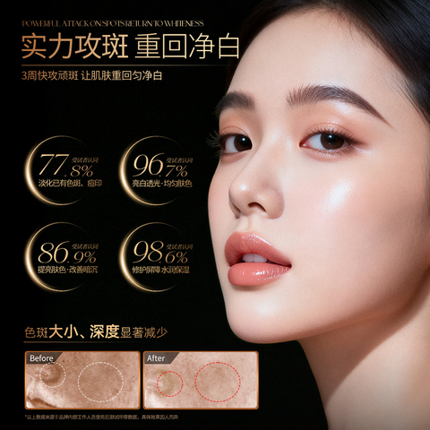 多种专利成分加持!持证美白祛斑! 靶向淡斑!7天肌肤亮白!14天淡化!21天塑造无暇肌肤! 从根源击溃黑色素!提亮肤色!淡化色斑痘印瑕疵!全脸360度美白祛斑!
