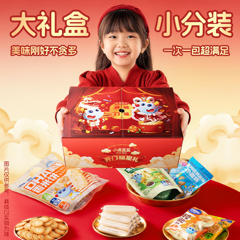 小鹿蓝蓝零食双开门礼盒,内含鱼肠、肉脯、米饼等多种儿童喜爱零食,口味丰富,适合元旦新年送礼。营养又美味,宝宝爱吃家长放心!