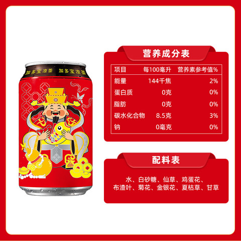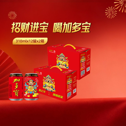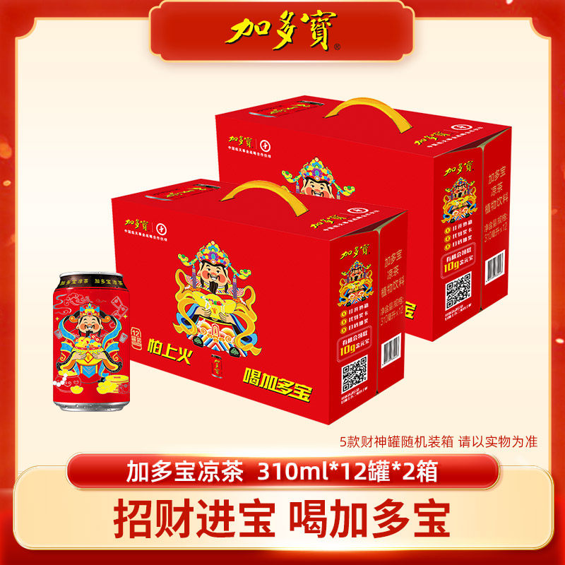 【活动价格79.9-官方立减20.1-优惠卷2元-88VIP95折减2.89-淘金币抵扣1.59-凑单消费卷200-25,到手46.68.财神罐310ml*12罐/2箱,单箱到手23.34,赠送加多宝限量拼图一盒】加多宝凉茶新春财神罐,310ml*12罐*2箱,清凉解腻,送礼自用都合适!年货节专属价,囤货更划算!