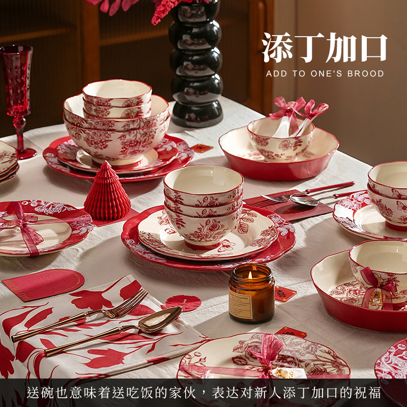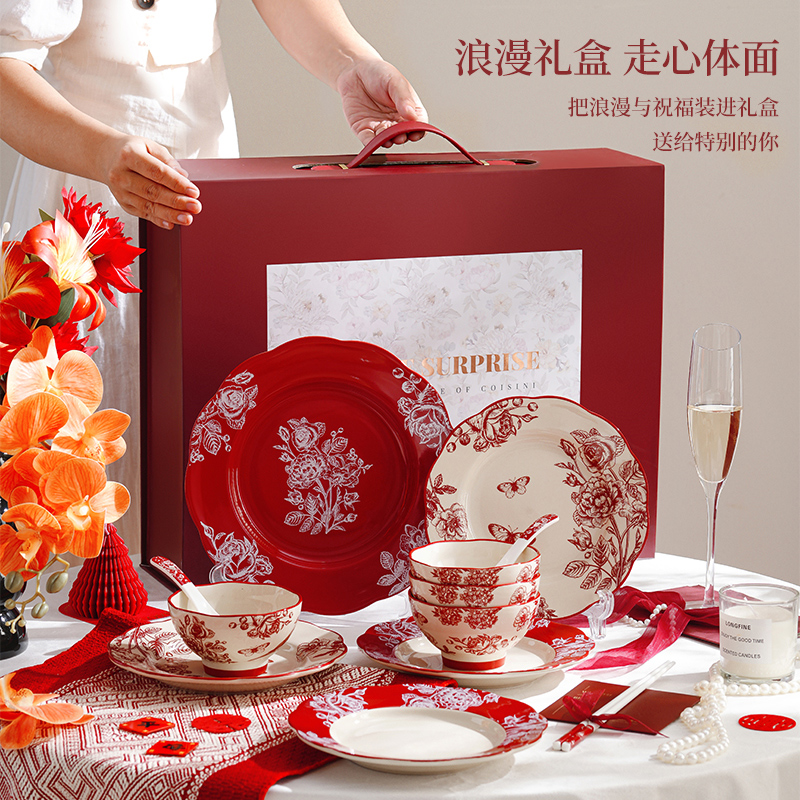 美康之家假日玫瑰碗盘筷套装高档碗碟餐具陶瓷红色新婚礼物送新娘