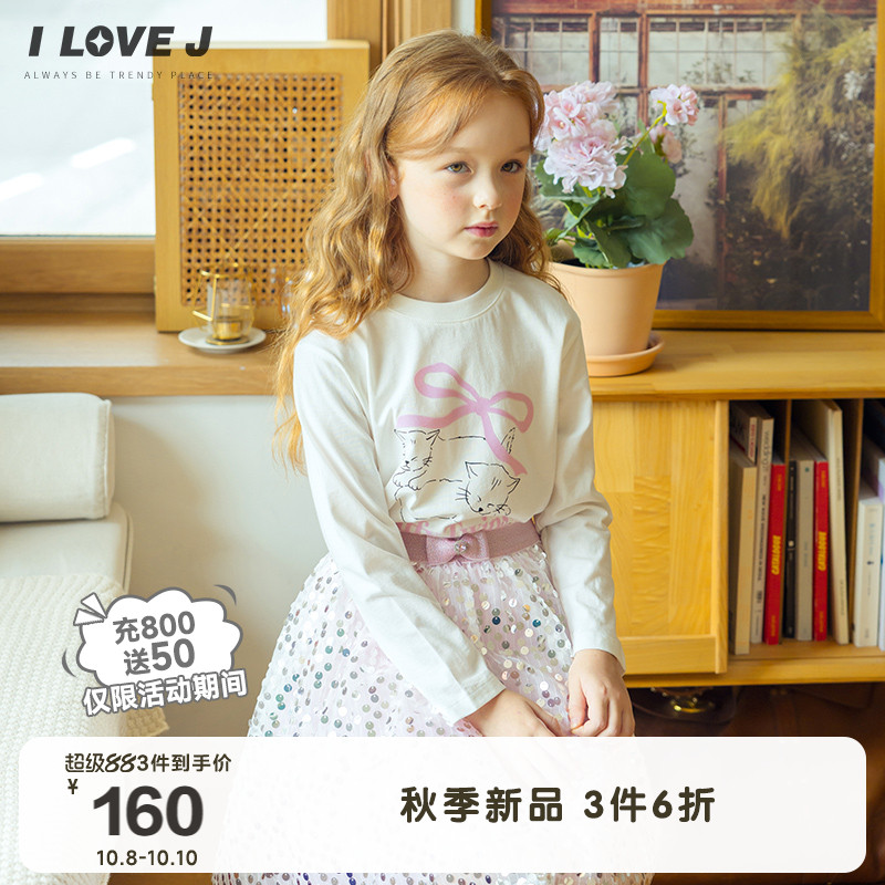 ILOVEJ女童小猫蝴蝶结白色T恤