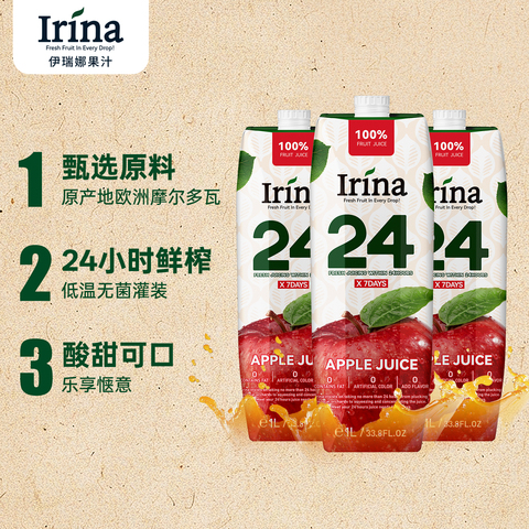 【进口鲜榨果汁】伊瑞娜摩尔多瓦苹果汁+桃子汁组合,0添加更安心!1kg大容量,口感清新自然,适合订婚、聚会等场合,品质优选!