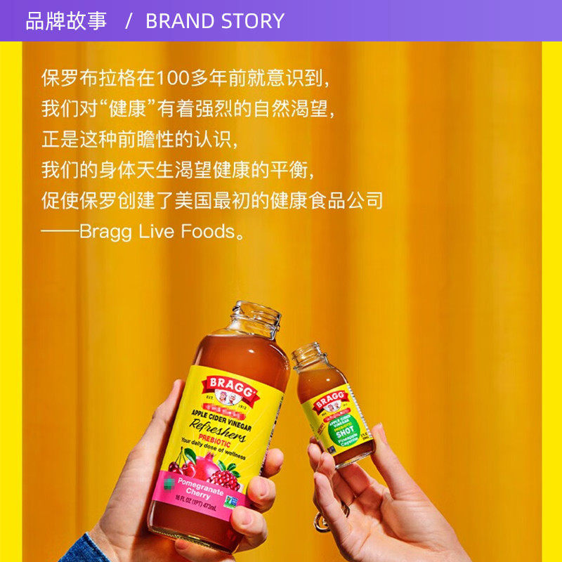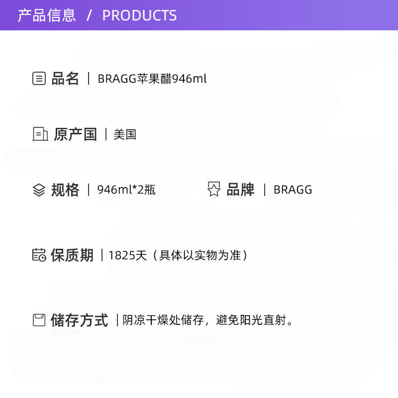【自营】BRAGG美国进口浓缩苹果醋0卡0糖0脂健康饮料946ml*2瓶
