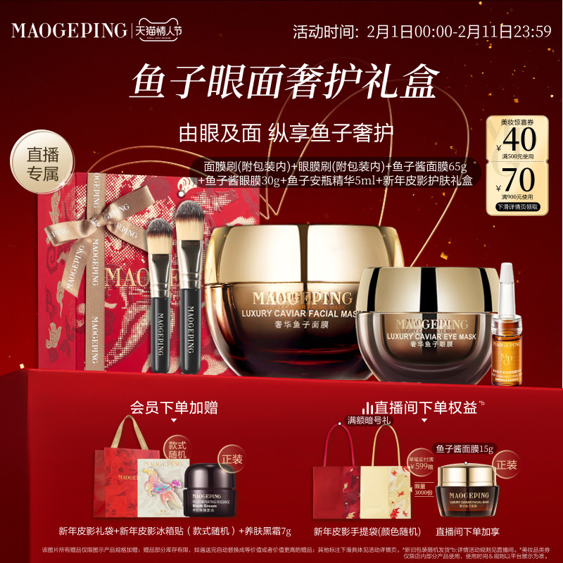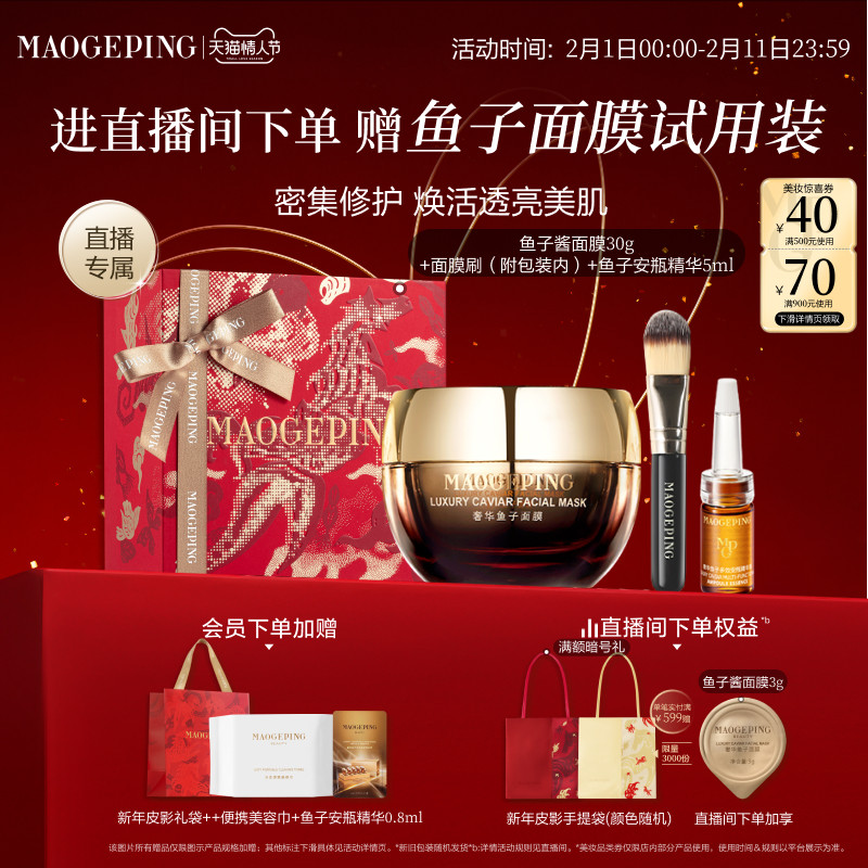 毛戈平鱼子酱面膜套装 【售价】:¥459.00 【券后】:¥449.00 【优惠券】:¥10 推荐理由:凑单395.05!(价格532--店铺券10元-官方立减64元-立减9元-消费券54.95元),到手鱼子酱面膜30g+鱼子安瓶精华5ml+便携美容巾+面膜刷+鱼子安瓶精华0.8ml,直播间赠鱼子酱面膜 👉复制这条信息打开【手机淘宝APP】即可领券购买:/