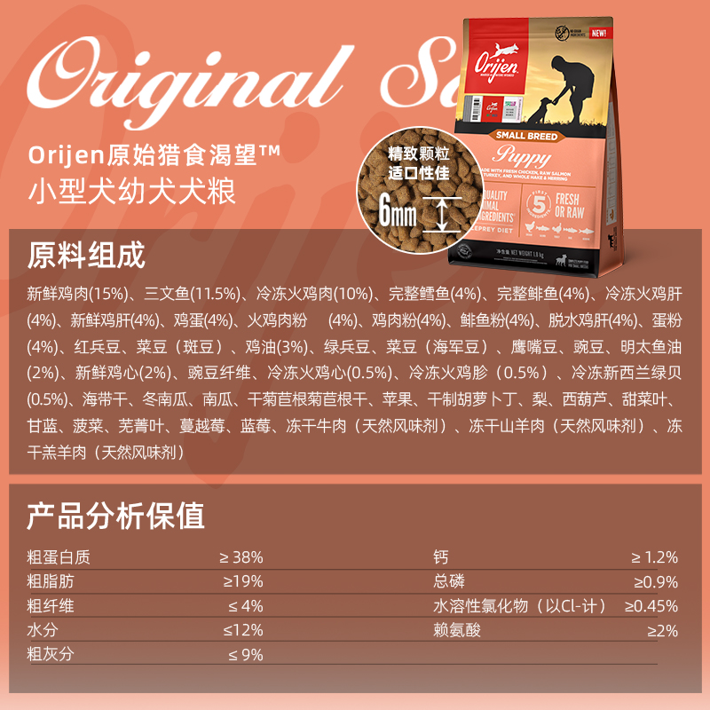 Orijen渴望幼犬粮,进口无谷高蛋白配方,专为小型犬幼犬设计,营养全面易吸收~ 全价主食粮,富含新鲜鸡肉、鱼肉,助力幼犬健康成长,口粮超值购~