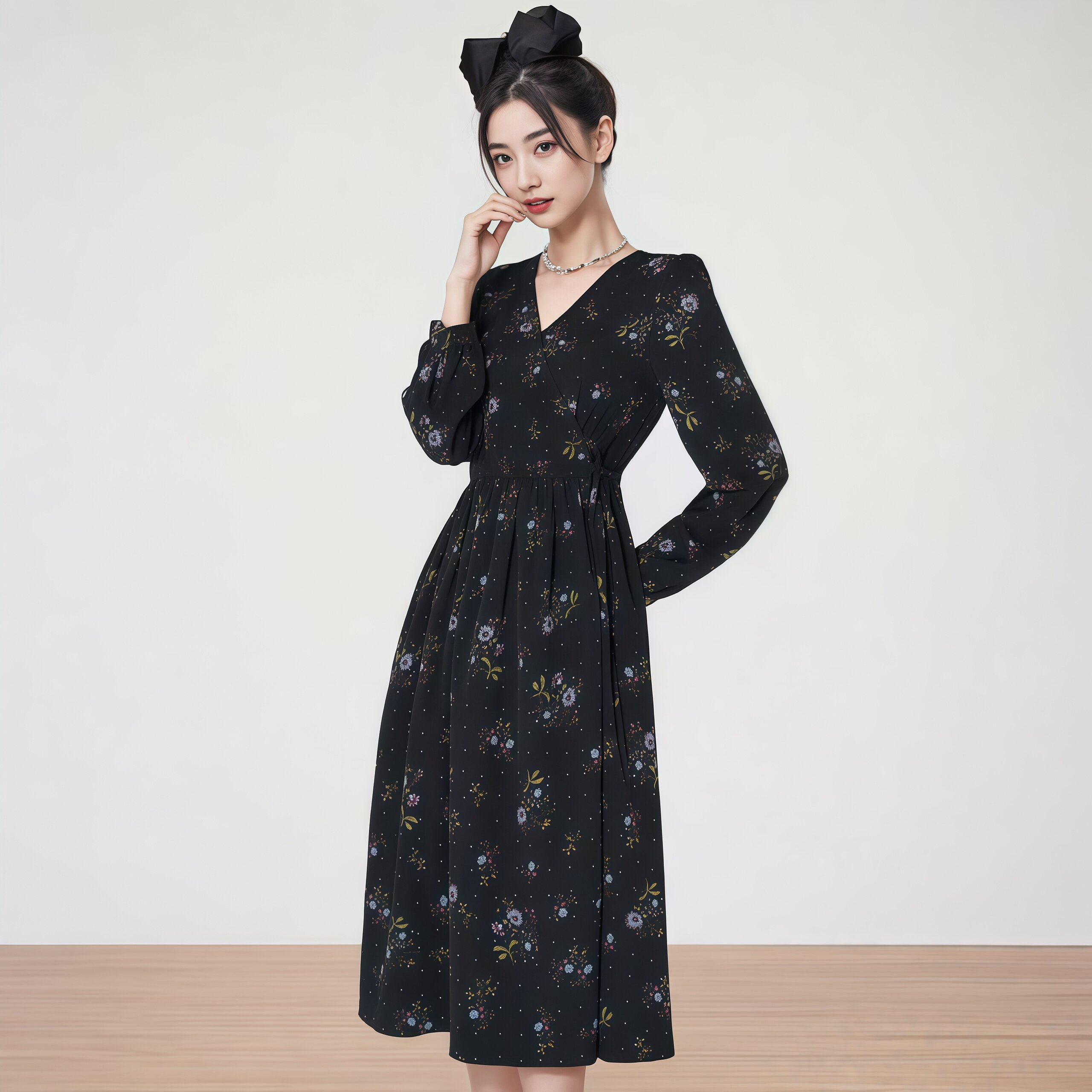 AK 2026新款赫本风法式白裙长袖连衣裙女收腰气质显瘦中长裙