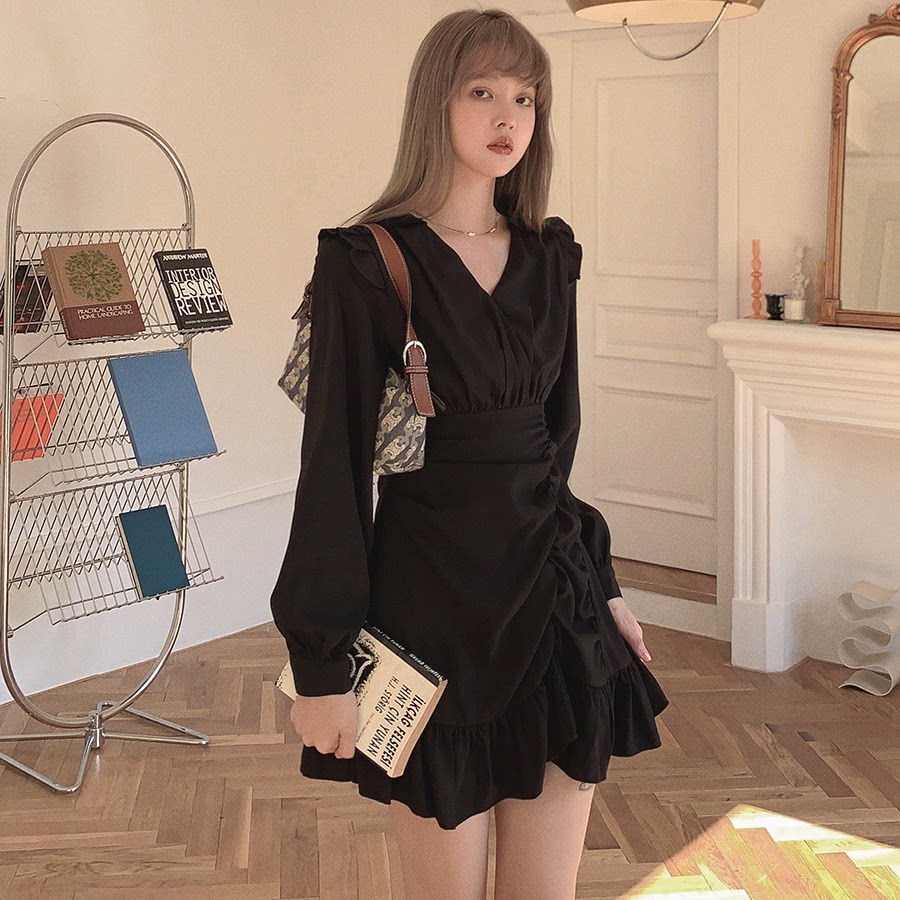 HF 2026新款赫本风法式白裙长袖连衣裙女收腰气质显瘦中长裙