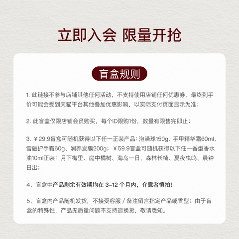 【赠送价值179,随机香型且悠滚珠香水油10ml*1】这款临期盲盒是集万千好物于一身的宝盒,开启盲盒瞬间带您领略护手霜、泡澡球、发膜、香水油等多重宝藏。每件产品均品质上乘,好用不踩雷!
