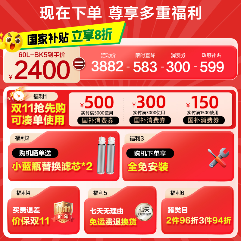 海尔热水器小蓝瓶除氯BK5 【售价】:¥2599.20 【券后】:¥2399.20 【优惠券】:¥200 推荐理由:【政府补贴20%+以旧换新到手2400起】全水路升级集成净化系统,滤杂除氯抑菌阻垢四合一,打造健康净水洗天花板,短薄设计高颜值,黄金小体积尽享安装自由,首创全水路集成净化模块,深层过滤杂质,还原活水本真 👉复制这条信息打开【手机淘宝APP】即可领券购买:/