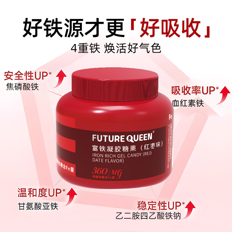 未来女王富铁软糖,专为女性和孕妇设计,含铁元素,补充气血,一颗软糖,轻松搞定孕期营养。