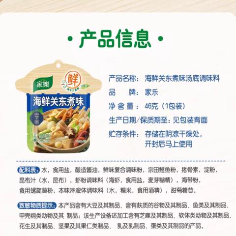 家乐关东煮汤料46g 【售价】:¥5.90 【券后】:¥3.90 【优惠券】:¥2 推荐理由:家乐这款关东煮汤料简直是减脂期救星0脂0糖,每包仅17大卡,比半个苹果热量还低!冷水下锅5秒速溶,昆布鲣鱼鲜香味瞬间拉满,煮啥都好吃白萝卜吸饱汤汁爆甜,水煮菜也能变珍馐!独立小包装,一次一包不浪费 👉复制这条信息打开【手机淘宝APP】即可领券购买:/
