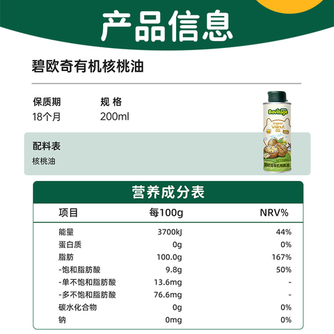【叠消费卷+淘金币到手32.25】,碧欧奇有机核桃油200ml宝宝辅食搭配用油儿童食品营养食用油