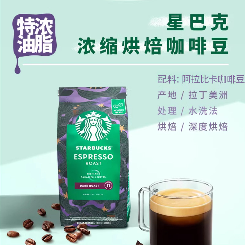 【88vip到手110;到手200g*2袋】浓缩烘焙咖啡豆,意式奶咖豆,醇苦低酸回甘,深度烘焙口感醇厚,风味浓郁,星巴克门店同款,可以直接饮用,也可以搭配牛奶,燕麦奶等,在家还原门店经典意式咖啡。