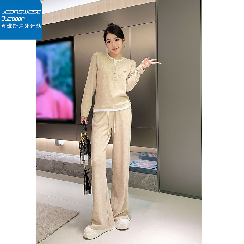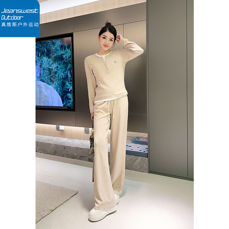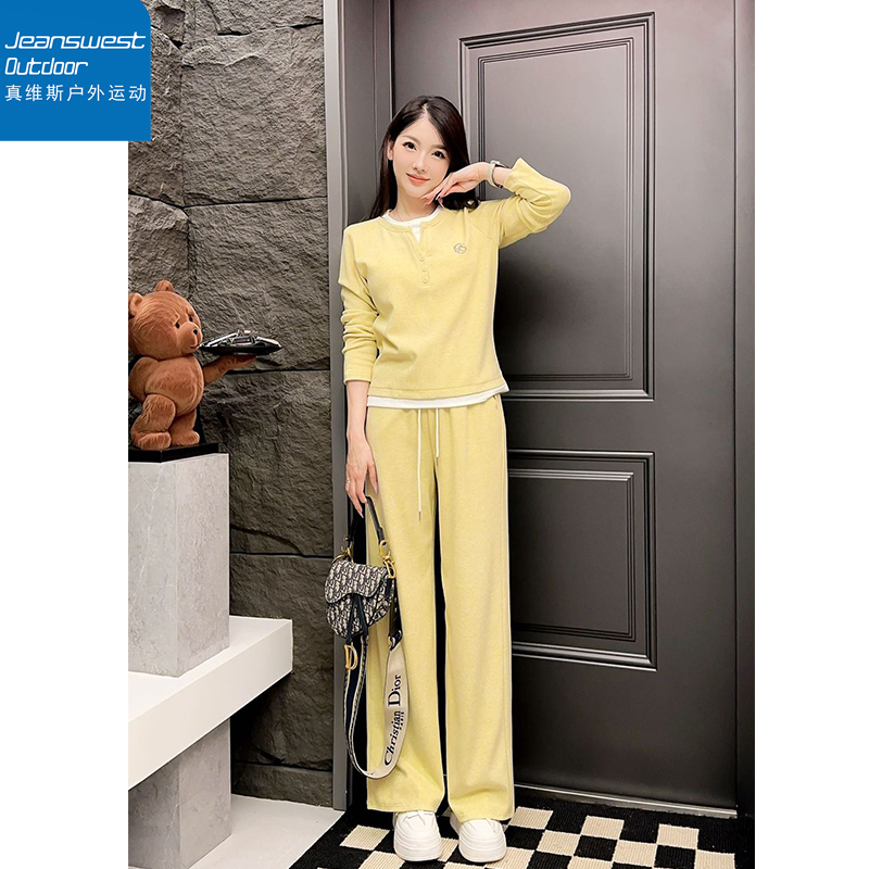 真维斯户外运动新款女秋纯色套装假两件百搭时尚阔腿遮肉显瘦长裤