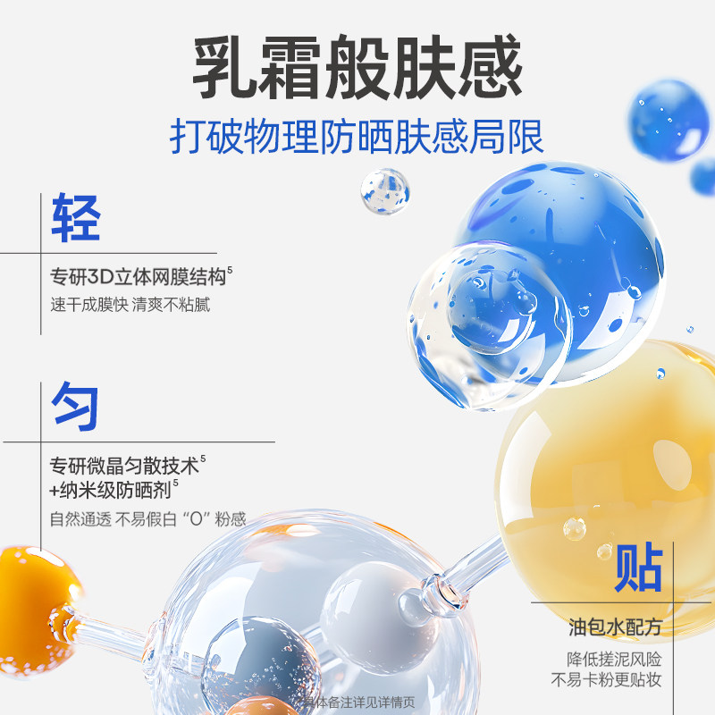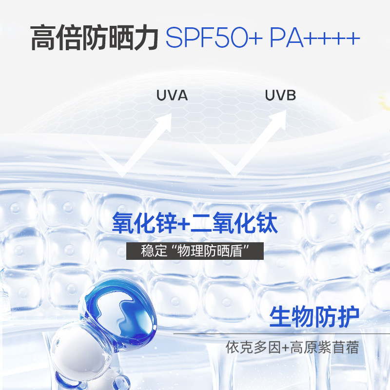 SPF50+,三重屏障呵护,防晒养护2合1,守护敏感肌。高倍防晒,清爽不粘腻易跟妆。6大不添加,肌肤无负担!