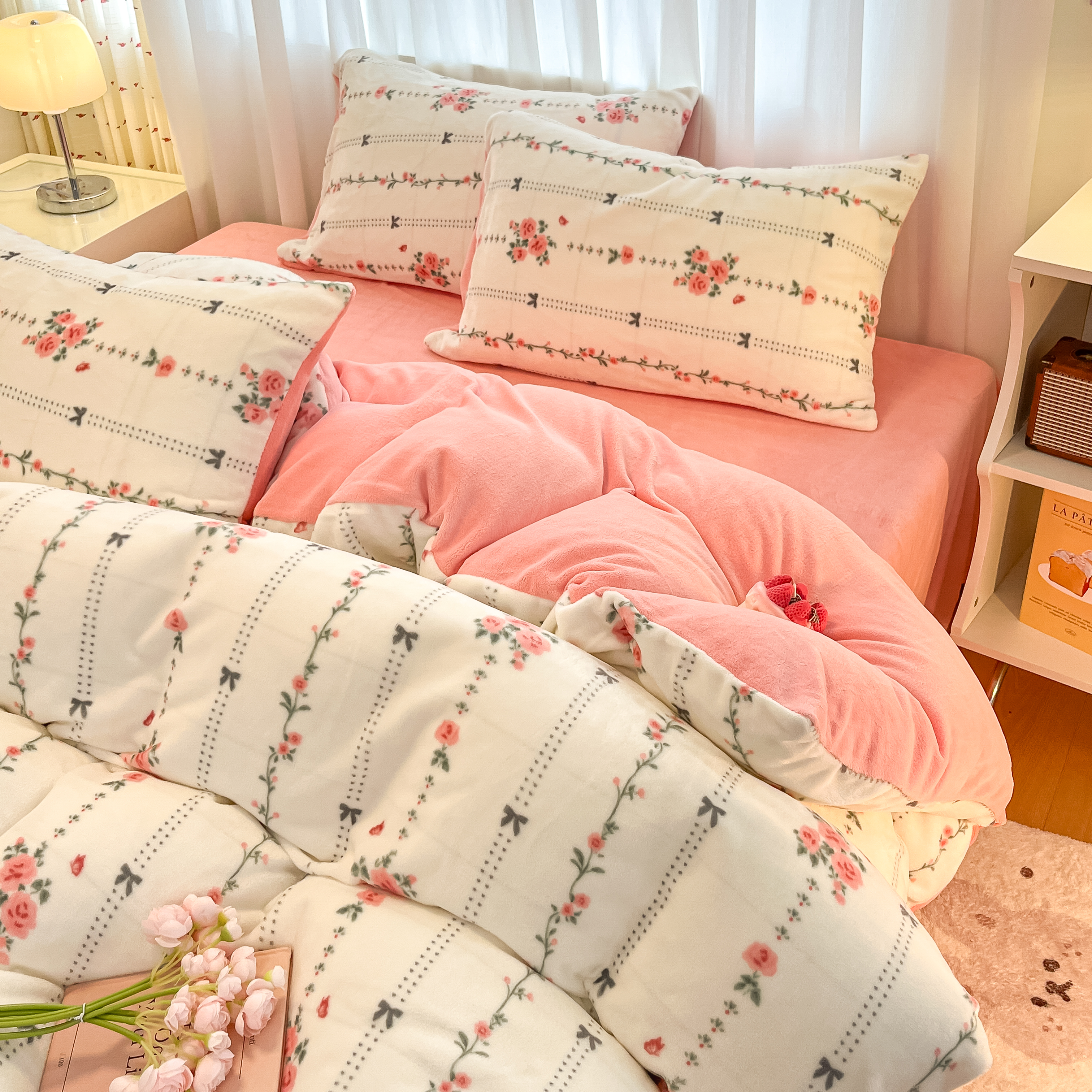 加厚牛奶绒,不掉毛,防静电,撸猫般的手感,比普通绒类面料更厚密度更高,精美印花设计,邂近美好,享品质生活,让每一次睡眠都意犹未尽。