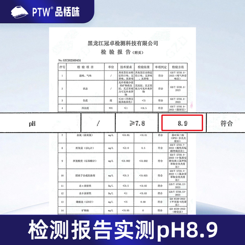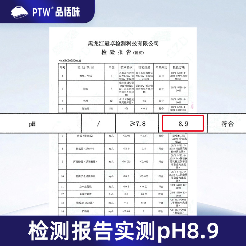 PTW天然苏打水源,天然纯净,蕴含丰富矿物质。其PH值呈天然弱碱性,口感清冽甘醇。坚持无糖、无汽、0卡路里,且无任何人工添加,还原自然本味,是追求纯净健康饮品的理想选择。