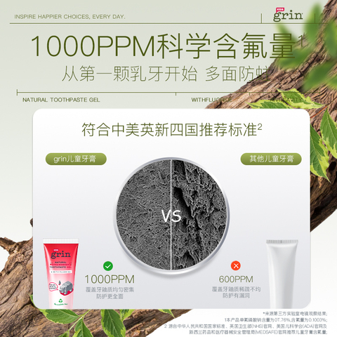 grin进口宝宝儿童牙膏含氟防蛀0到3-6-12岁不辣口换牙期植萃低泡