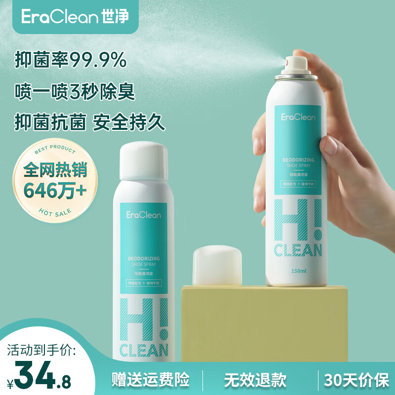 EraClean鞋子除臭杀菌喷雾银离子杀菌除臭喷雾鞋子除味剂杀菌抗菌 【第二瓶9.9元】两瓶装