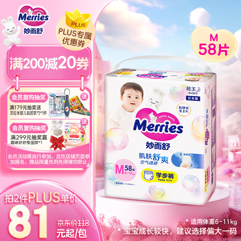 花王妙而舒拉拉裤M58片(6-11kg)中号婴儿尿不湿防漏宝宝屁屁舒爽畅玩