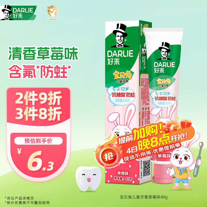 DARLIE好来(原黑人)宝贝兔儿童牙膏2-3-6-12岁 草莓味40g 含氟防蛀抗糖