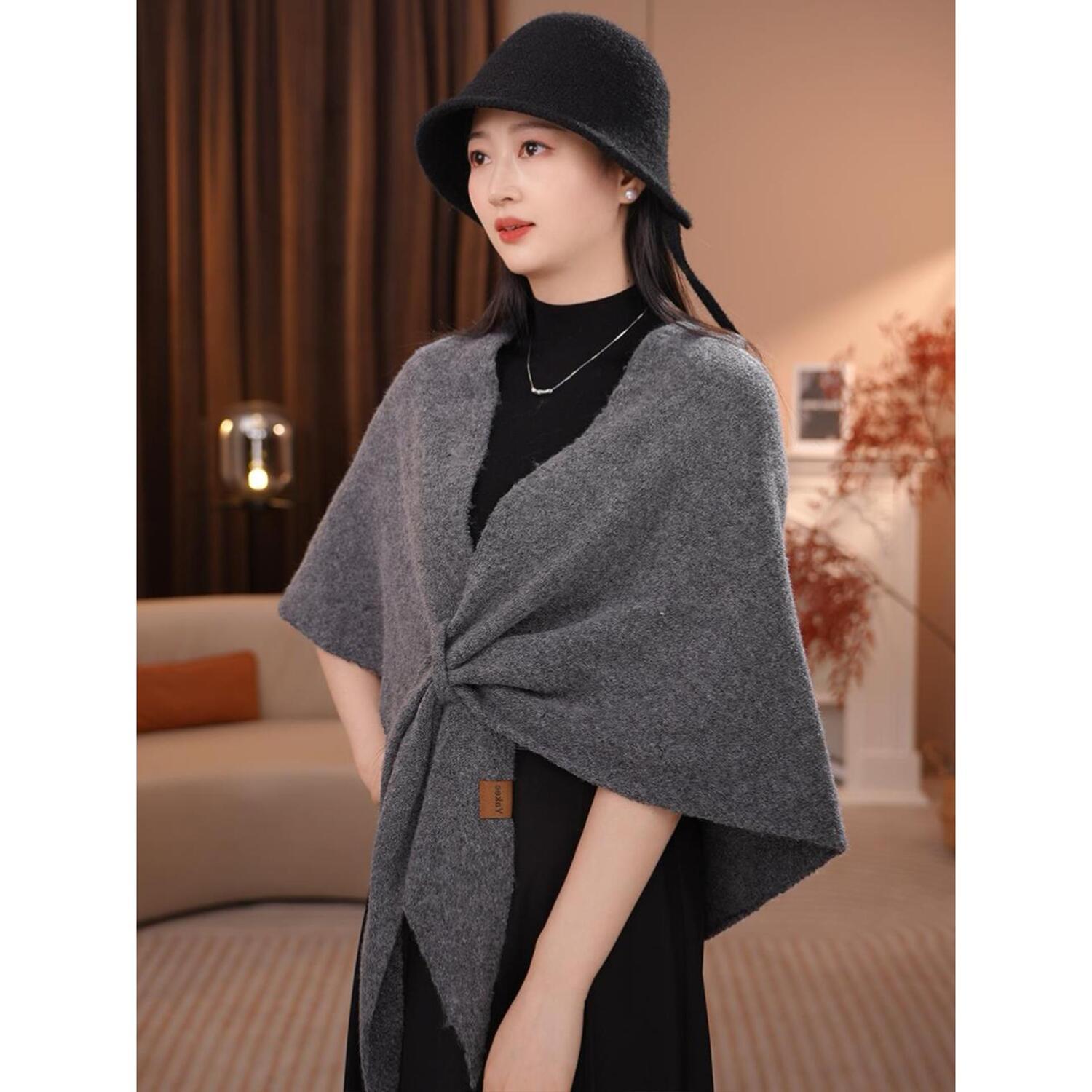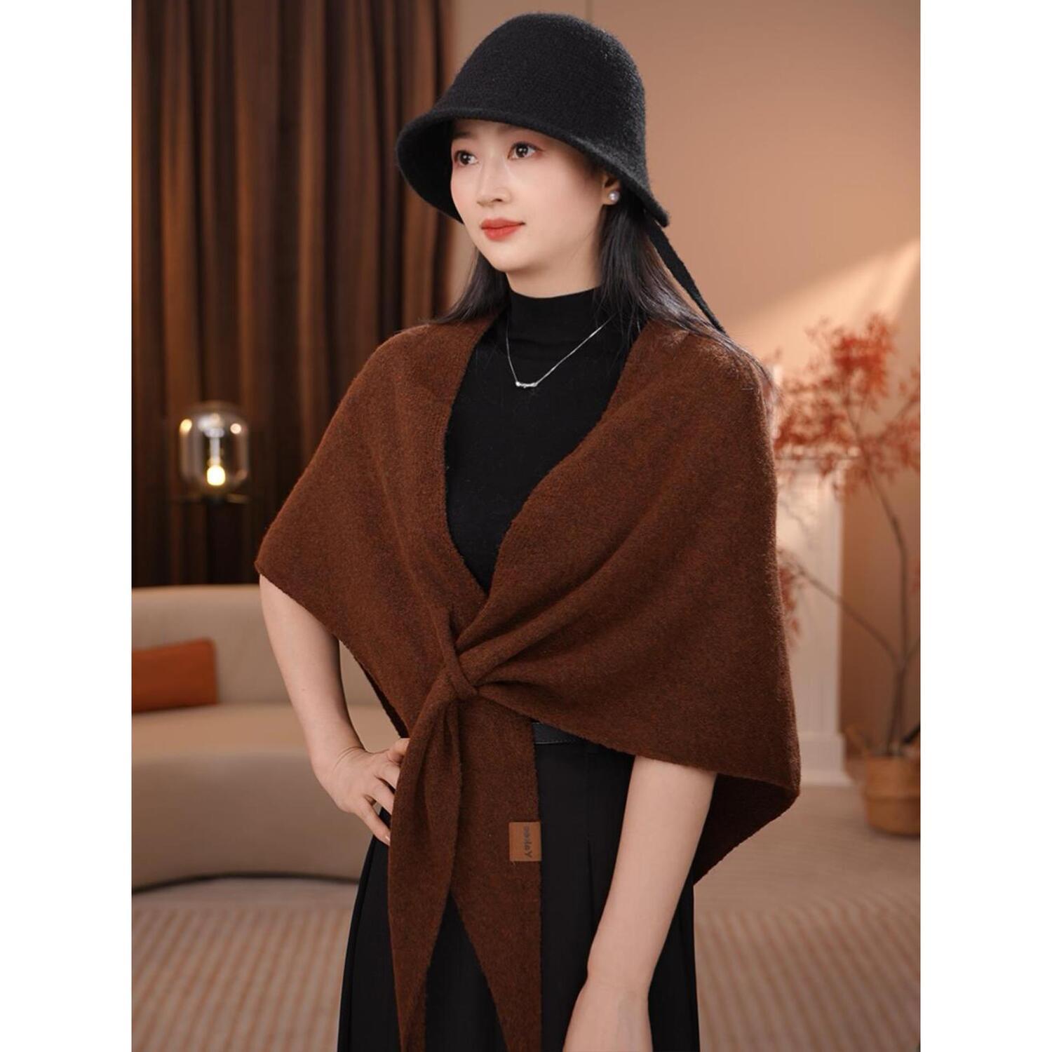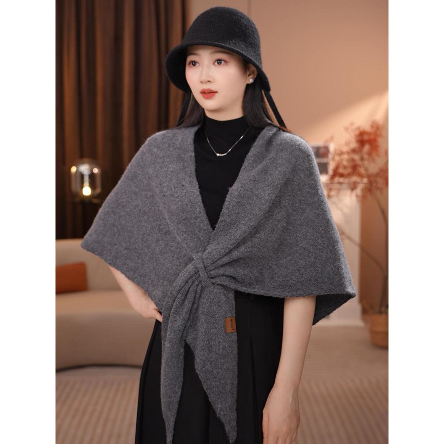 正版时尚高质感羊毛混纺三角披肩秋冬新款纯色系带围脖不规则披风