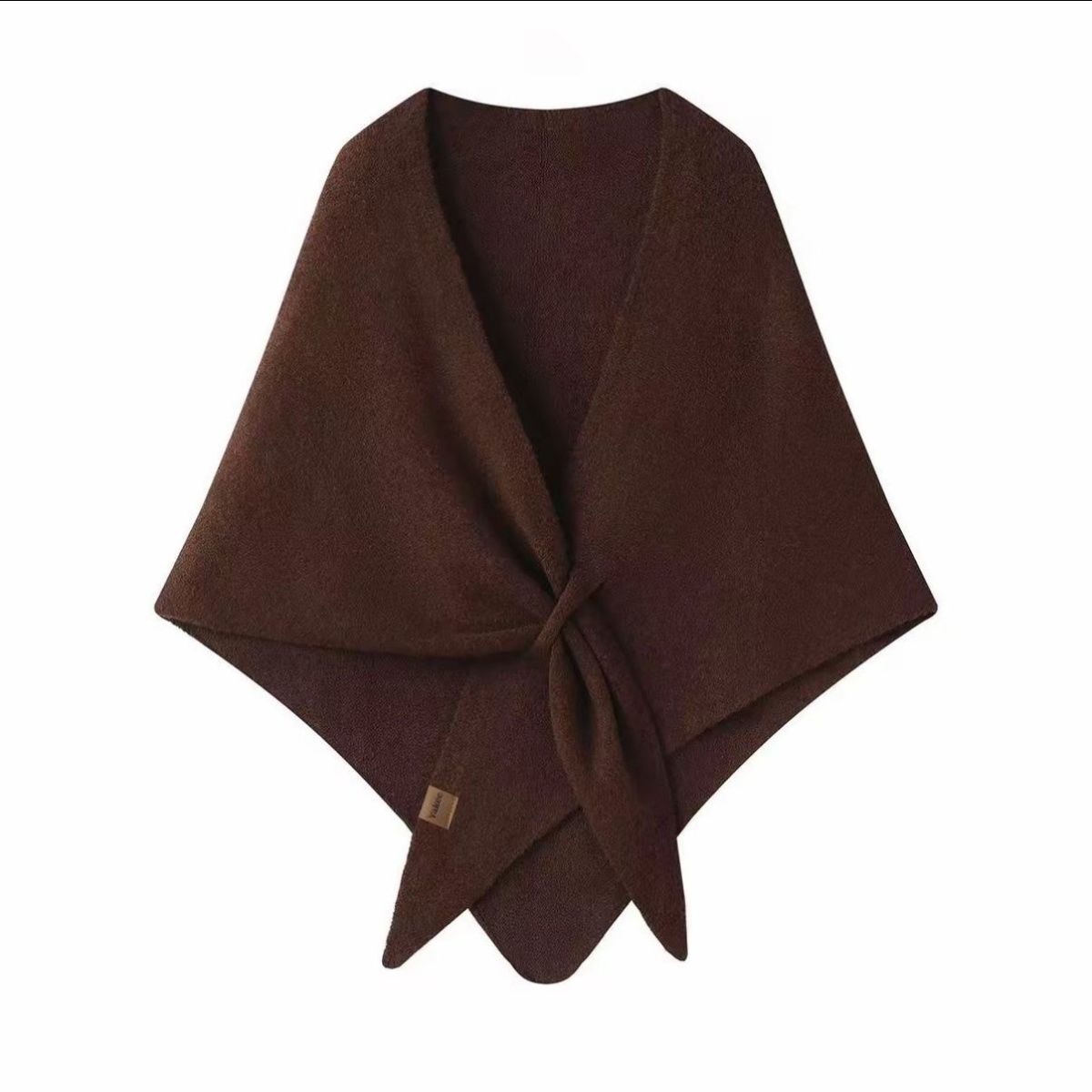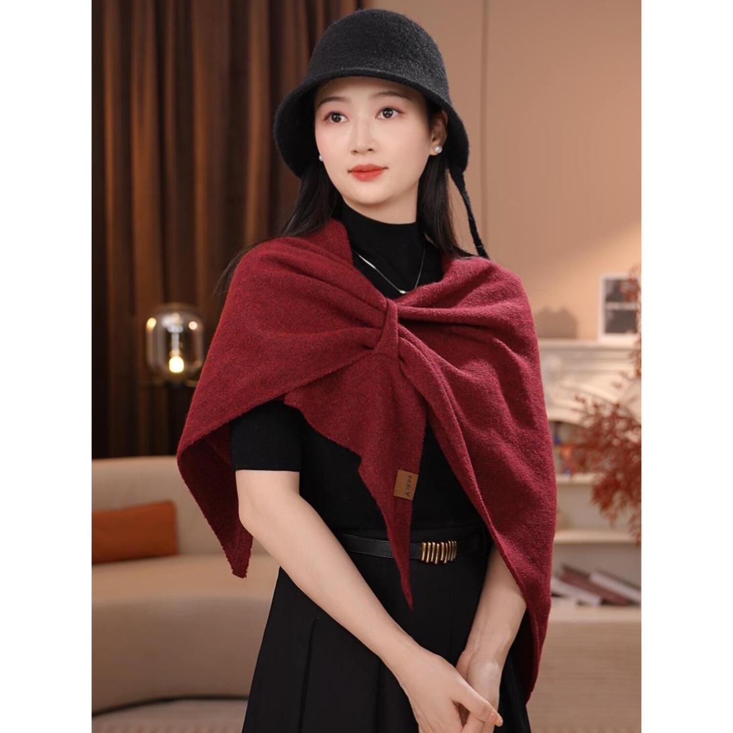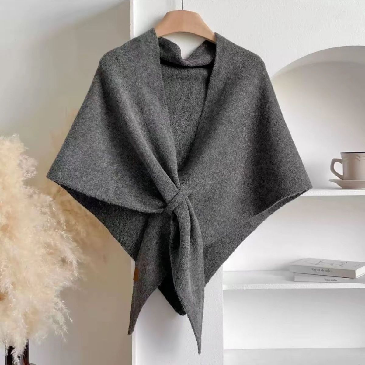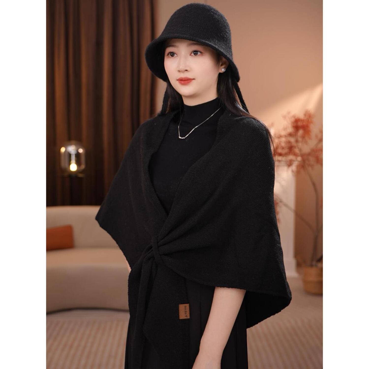 正版时尚高质感羊毛混纺三角披肩秋冬新款纯色系带围脖不规则披风