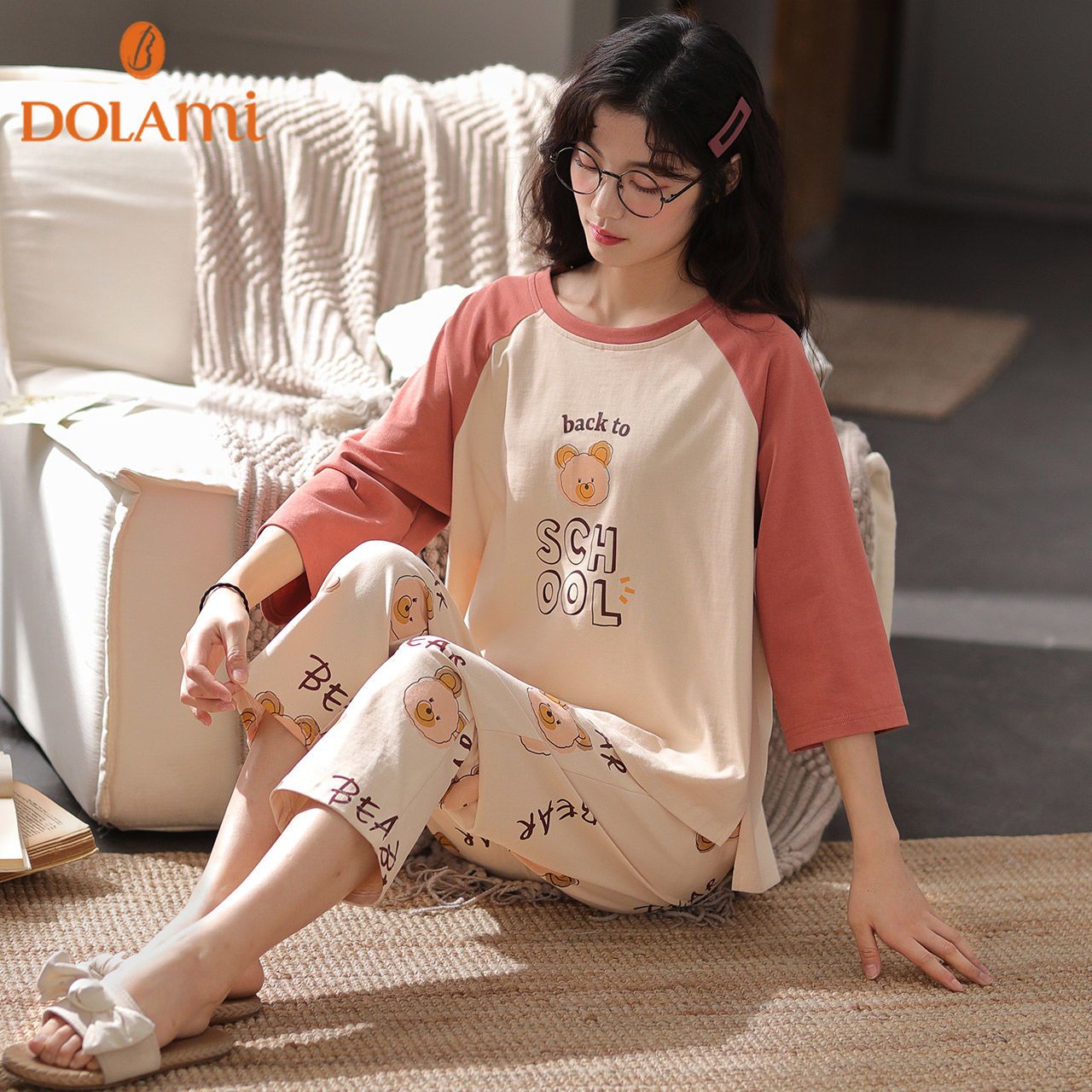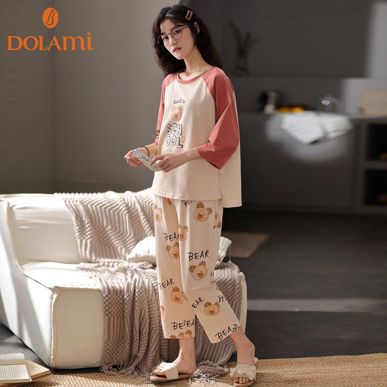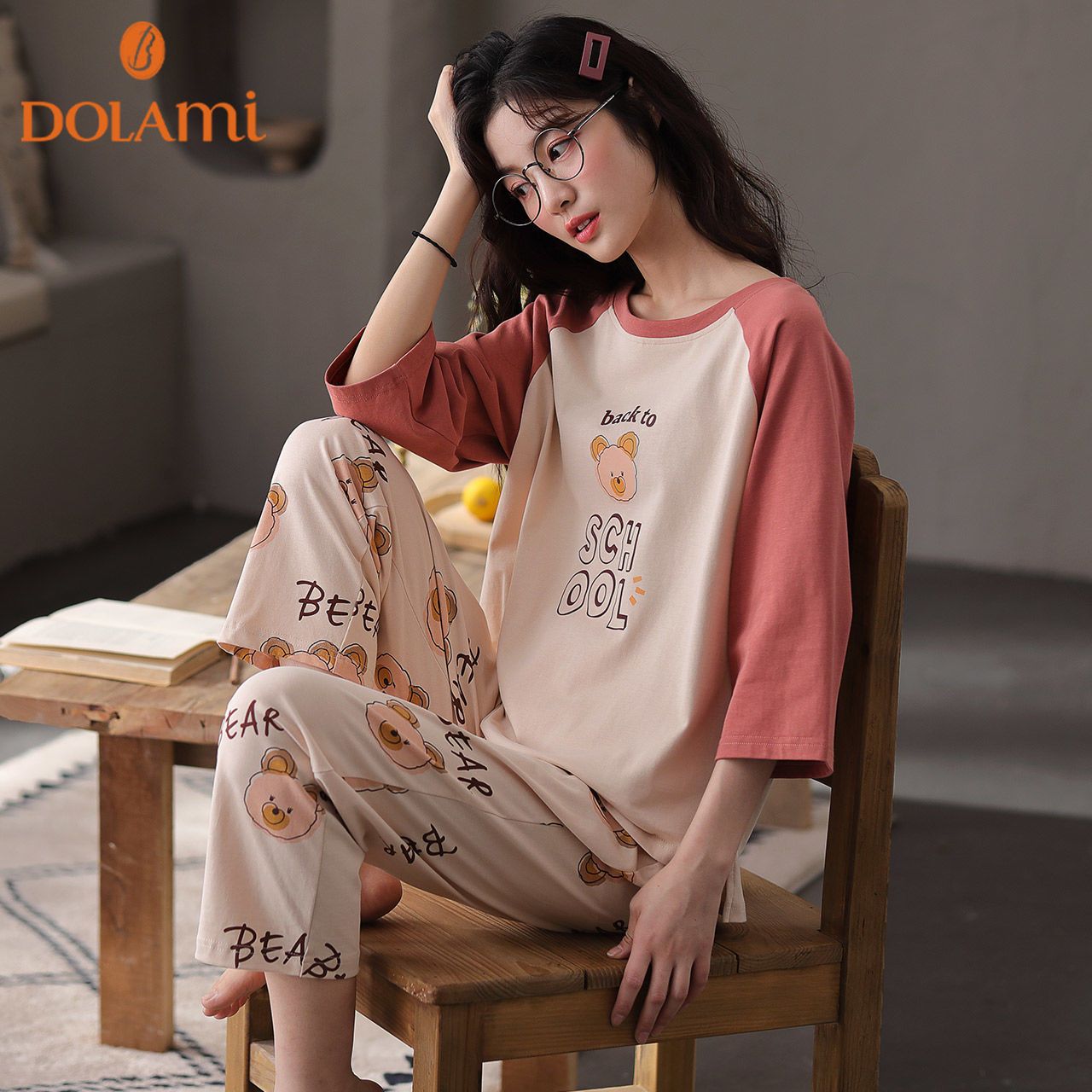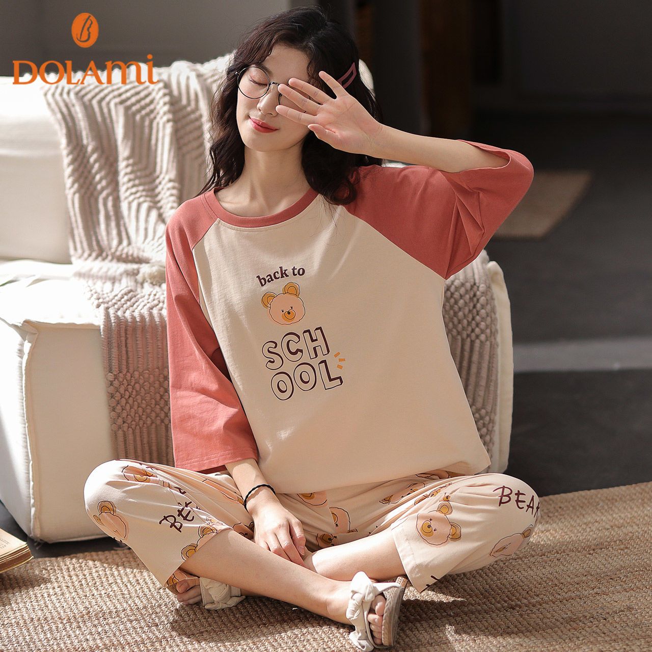多拉美睡衣女新款春秋季纯棉七分袖休闲可爱薄款可外穿全棉家居服
